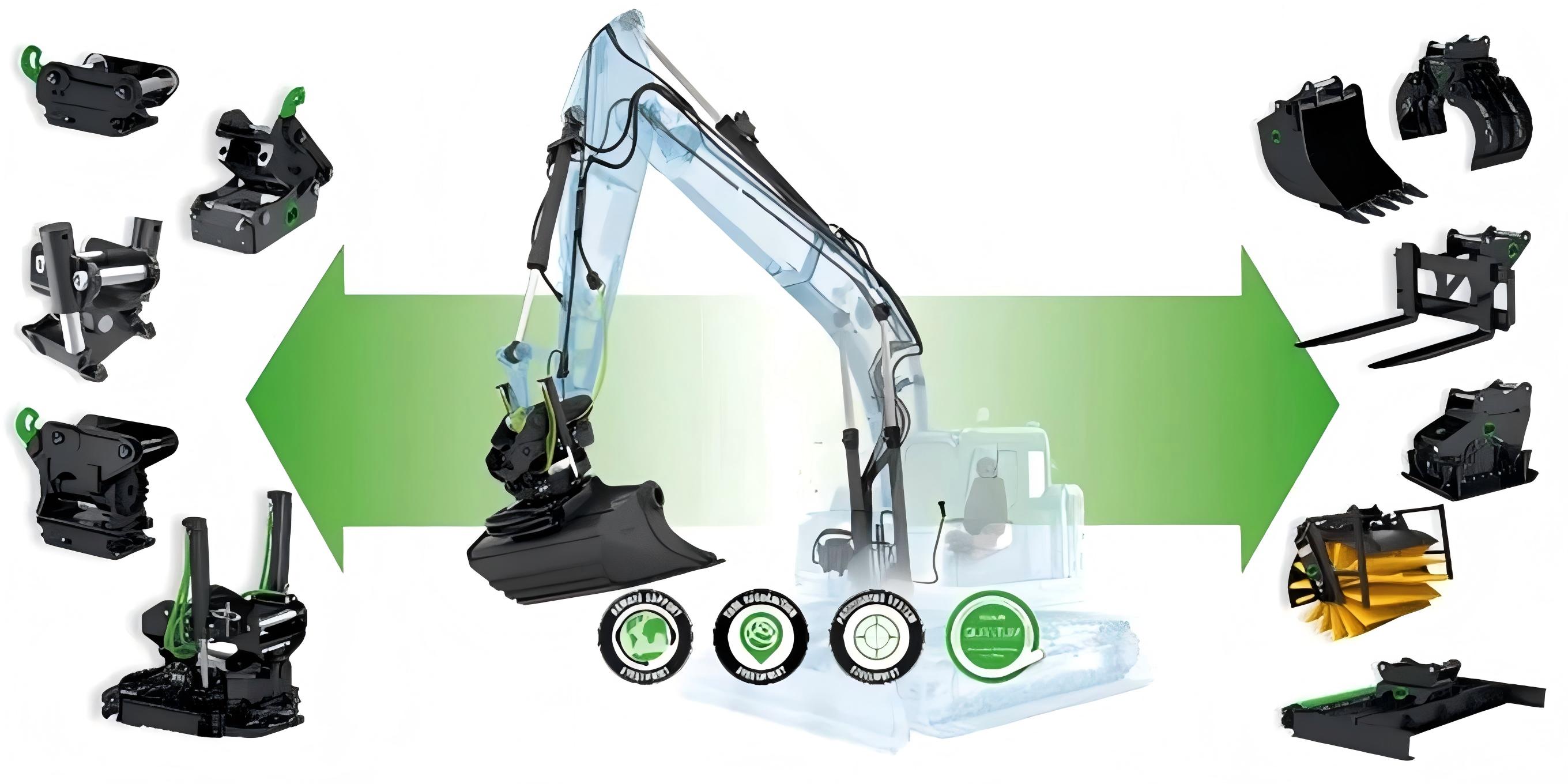 الوحدة النمطية المتكاملة الهيدروليكية: يدمج الاقتران السريع الدوار الذي طورته Kyungwontech في كوريا الجنوبية آلية تروس بين المكونات العلوية والسفلية لتحقيق دوران 360 درجة من الملحق. على سبيل المثال ، يمكن أن يميل حفارة الزاحف المجهزة بدلاء دوار بشكل جانبي عند 65 درجة لتقليص المنحدرات دون الحاجة إلى تعديلات متكررة على الجسم.